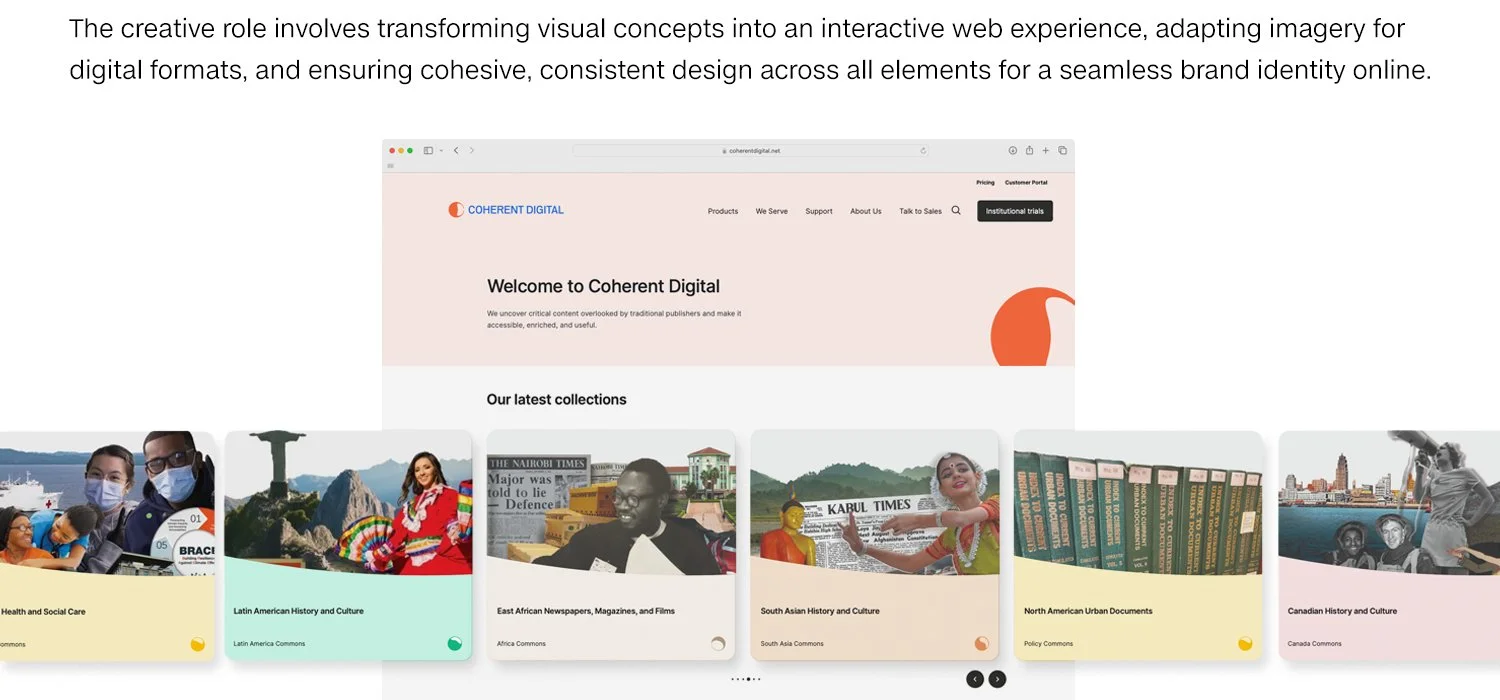 Coherent Digital serves more than 1,200 organizations on six continents, offering diverse collections and services designed to advance research and learning. Our role was to shape and unify the brand identity, establishing a cohesive visual aesthetic across their global line of published materials, website and social media presence. Each piece of artwork is crafted to visually communicate the unique essence and content of each collection.